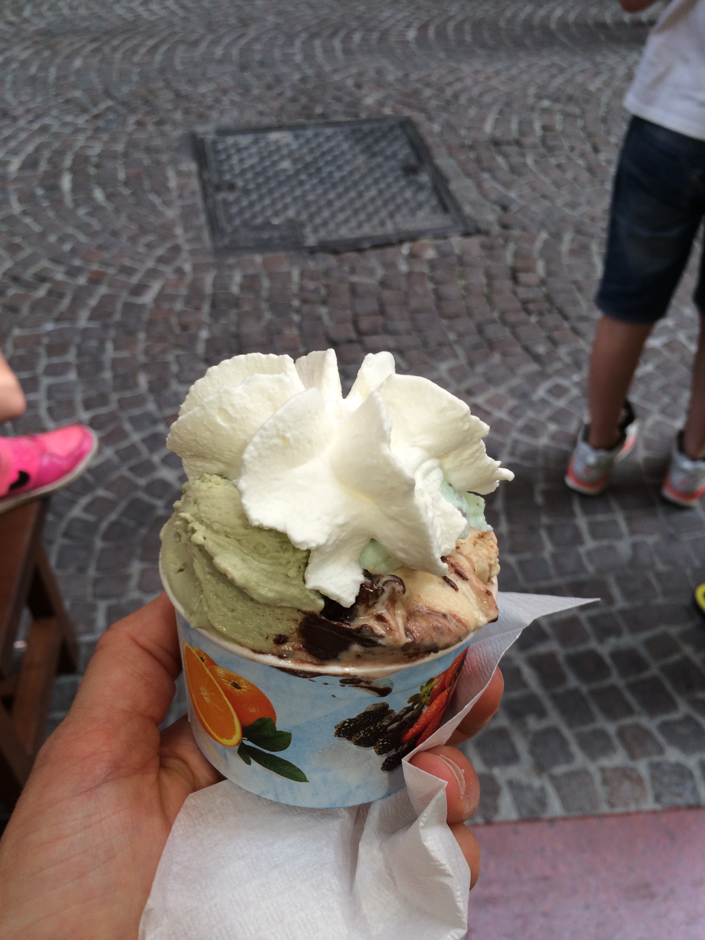 After two mini sandwiches with prosciutto and salami (of course), 3 bruschetta (which by the way, the “ch” is NOT pronounced like “sh”, it’s a “k”. I learned that the way most Americans say it means lady of the night in Italian. Not exactly a good thing when you’re asking for it to eat…) with 3 different spreads that I still do not know what they were, and 2 glasses of white wine, I decided to indulge in gelato from the store that was said to have the best gelato in the region. Boy, was it good but the measly two scoops I was given just weren’t enough so what did I do once I got closer to the main square?