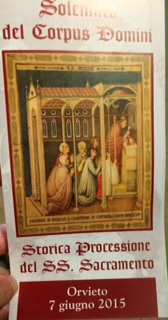 “…this day is celebrated the miracle of the Sacramental Bread, the Eucharistic miracle of Bolsena. Tradition has it that in 1263 a Bohemian priest, Peter of Prague, going to Bolsenastopped to celebrate Mass at the altar of St. Cristina. The priest was plagued by doubts. He did not believe possible the transformation of the bread and wine into the body and blood of Christ. During the consecration a miracle occurred: blood gushed from the communion bread.”