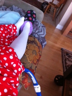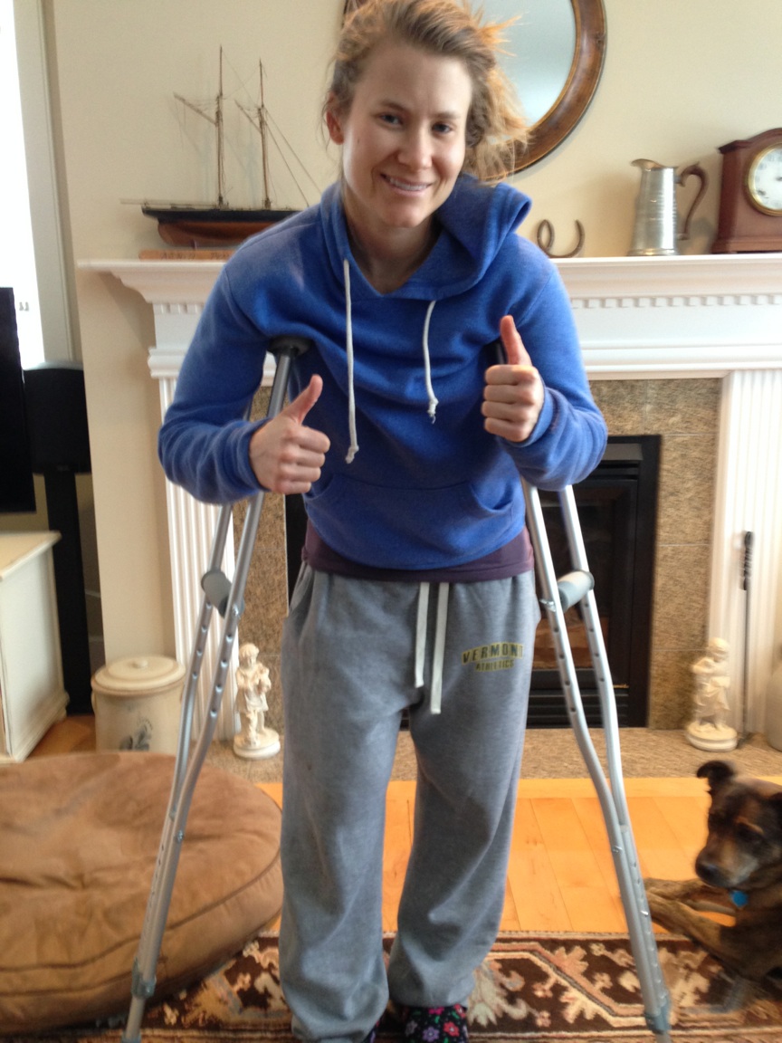 So I am on day 3 of recovery and I can manage to lift my own leg without excruciating pain! (Even though within seconds it aches quite badly) Up until today my parents had to lift my leg onto and off of the couch for me. When I use my crutches I can actually swing my leg a little bit without pain which is a first. The intervals between drug taking is spacing out – instead of every 4 hours its more around every 6-7. I feel a little less helpless than I did the last two days. And I managed to change out of my red polka dot pajamas and actually put contacts in. And since today is the UVM Carnival I decided to represent by wearing my Catamount Athletics sweat pants!